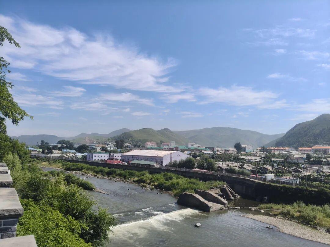 鸭绿江沿岸风光旖旎,江水在阳光下闪着金光,对岸则是神秘的朝鲜国土,山峦起伏,静谧得令人印象深刻,江风灌入车窗,带来湿润的水汽。