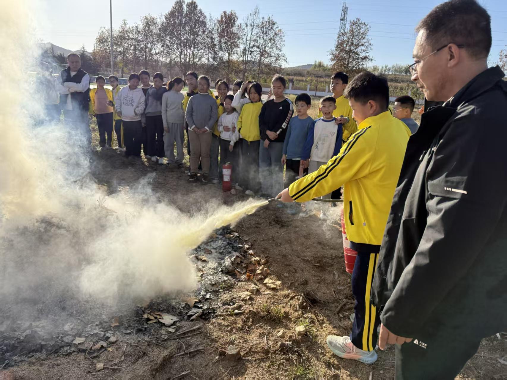 全体师生安全抵达操场集结点后,演练随即进入实操环节。学校安全员现场讲解灭火器的构造、灭火原理及“提、拔、握、压”的使用步骤,通过“手把手”示范,指导学生分组进行灭火器灭火实操练习。学生们热情高涨,在安全员的看护下依次操作,亲身掌握火灾初期的扑救技巧,进一步拓展了应急技能储备。
