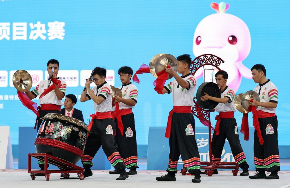 11月11日,粤港澳联队在第十五届全国运动会群众展演舞龙舞狮南狮自选项目决赛比赛中。最终,粤港澳联队获得一等奖。 新华社记者 王鹏 摄
