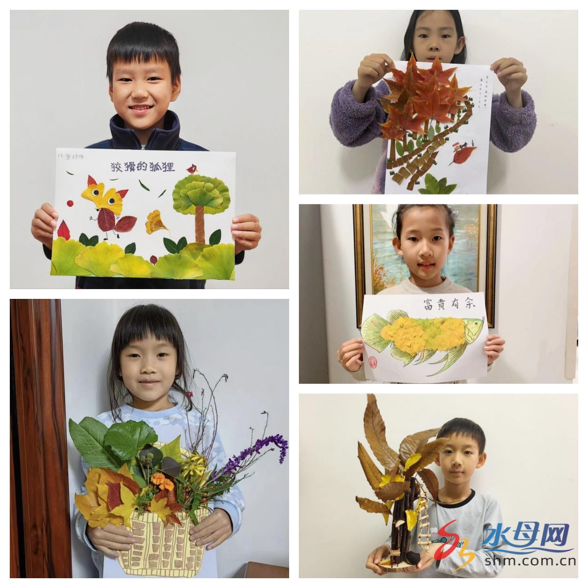 活动中,同学们的作品各具巧思:有的以校园常见的银杏叶、梧桐叶为素材,拼贴出活泼的人物与可爱的小动物,叶脉与色彩自然勾勒出生动的表情与姿态;有的采摘山野红枫,叠出《山行》中“枫林晚”的意境,再以梧桐叶剪作车马,让“停车坐爱枫林晚”的诗意跃然眼前;还有同学巧妙运用银杏叶的扇形纹理,拼成“富贵有余”的金龙鱼,旁配稚朴题字,为传统吉祥图案添上一抹秋日的清新。更有同学用不同颜色的叶子拼出中国地图,并缀以“我爱我的祖国”的真情告白,将家国情怀融入指尖艺术。此外,松果与落叶组合的立体手作、彩叶点缀的“秋日礼帽”等作品,更让自然素材突破平面,成为可触、可感的趣味艺术。