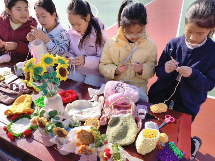创意手工区则是“色彩与巧思的集合地”,钩针编织社团的桌前,明黄的向日葵花束、软萌的编织包摆满桌面,女孩们指尖翻飞,毛线在钩针间渐成精致纹样;彩泥社团的展示架上,果蔬造型的挂件色彩鲜亮,戴着花朵发箍的学生举着自己的作品,笑眼弯成了月牙——手工的温度里,藏着少年们的细腻与创意。