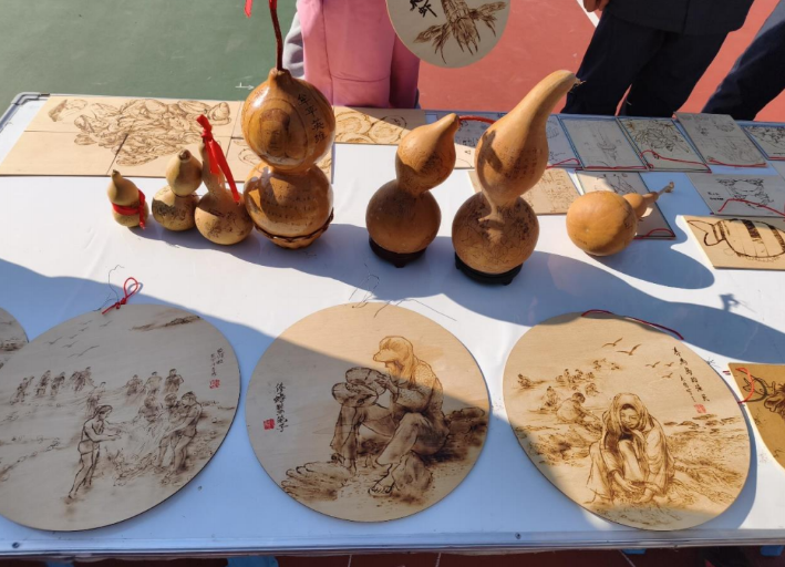 非遗与传统技艺区里,葫芦烙画社团的展台格外亮眼,形态各异的葫芦上,烙痕勾勒出人物群像与生活场景,搭配书法题字,将非遗技艺揉进校园创意;圆形木片烙画作品里,渔家劳作的画面细腻生动,墨印与烙痕交织出独特的文化质感。一旁的书画社团展台,国画组的梅枝斜逸出宣纸,书法组的软笔作品笔力舒展,引得不少同学驻足临摹笔法。
