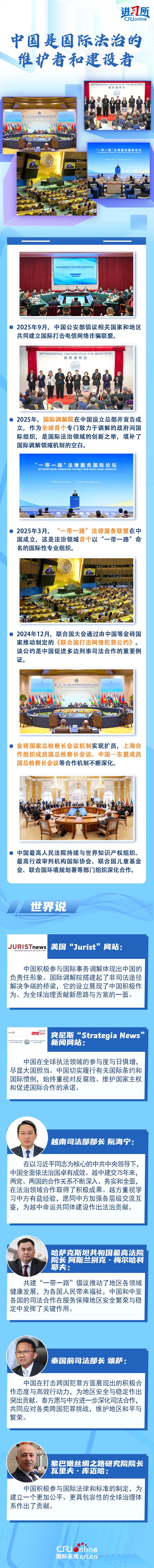 “以国际良法促进全球善治,助力构建人类命运共同体。”作为国际法治的维护者和建设者、全球治理的参与者和推动者,中国积极参与联合国框架下的国际规则制定,主动推动国际争端解决机制的完善,推动国际关系法治化。国际社会普遍认为,中国积极参与国际法律和标准的制定,尽显大国担当,为建立一个更加公平、更具包容性的全球治理体系作出了贡献。