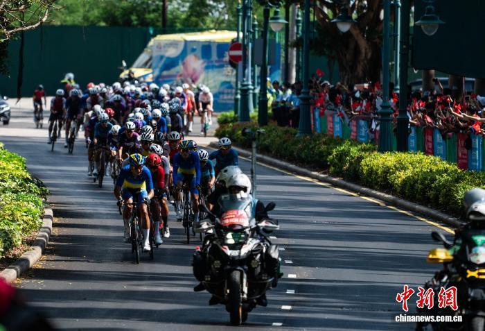 11月8日,第十五届全国运动会(十五运会)公路自行车男子个人赛举行,这是本届全运会唯一一项跨越粤港澳三地的比赛项目。图为选手们途经位于香港迪士尼乐园度假区幻想道的赛道。 中新社记者 侯宇 摄