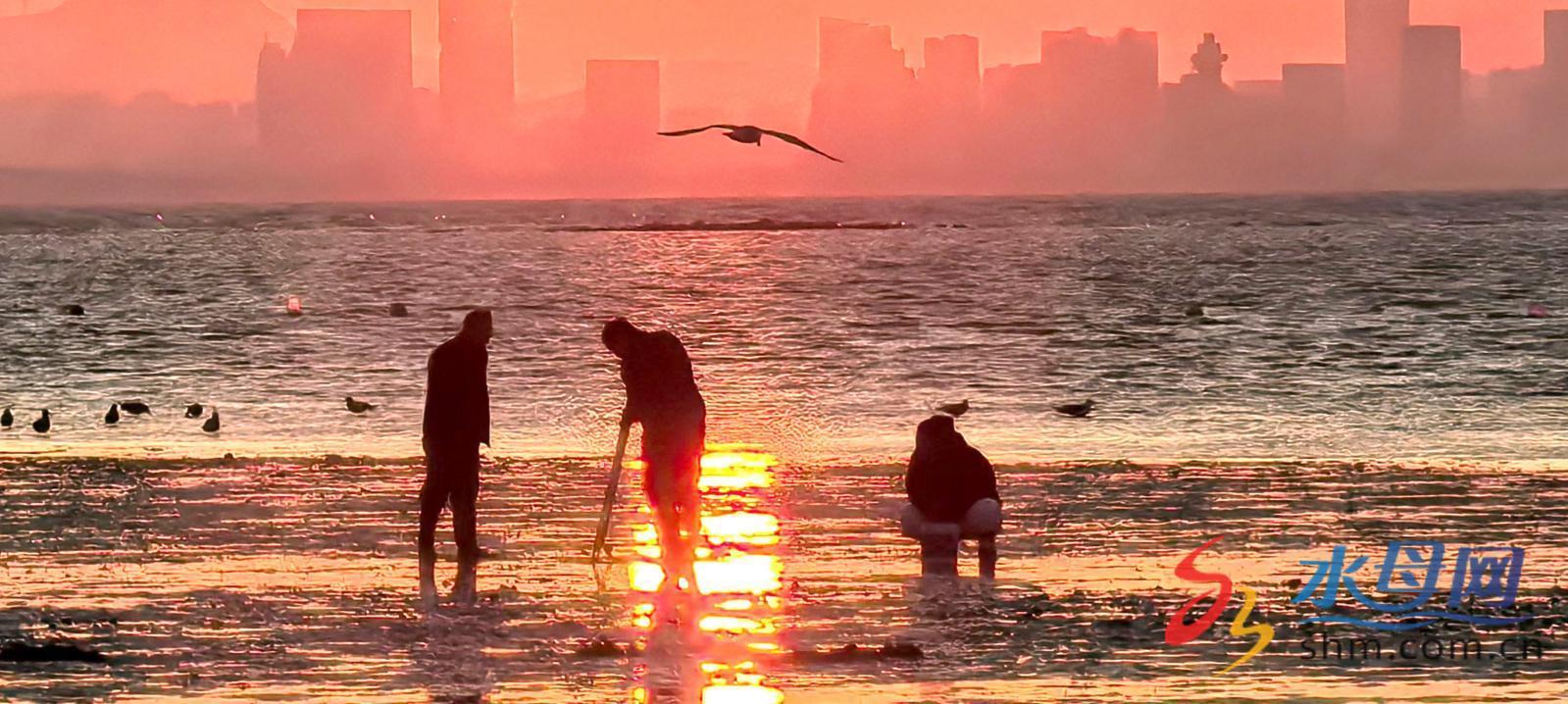 初冬的黄昏,夕阳映照在芝罘岛西海岸退潮后的海滩上,余晖洒在赶海人的身上,勾勒出一幅勤劳而温暖的画面。 娄勇智 摄