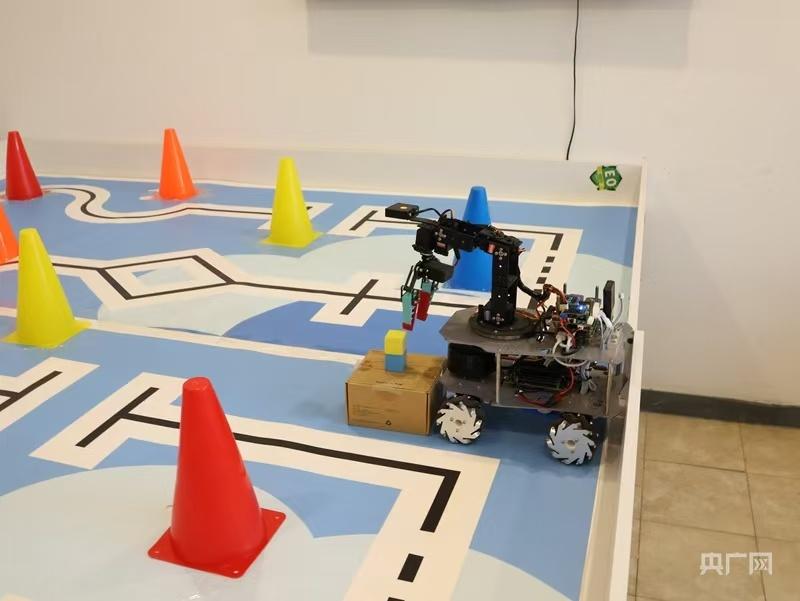 科研人员展示由“片上脑”操控的小车避开障碍物,精准抓取目标物品 (央广网发 文峰 摄)