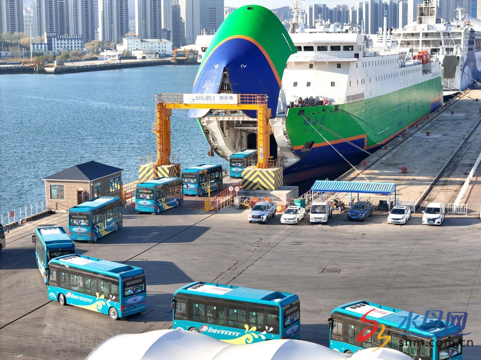 26日,一批全新的纯电动公交车在烟台港登上新能源汽车运输船“绿安达”轮,跨越渤海海峡前往辽宁大连,交付大连交运集团。YMG全媒体记者 唐克 摄