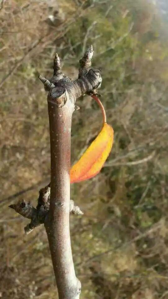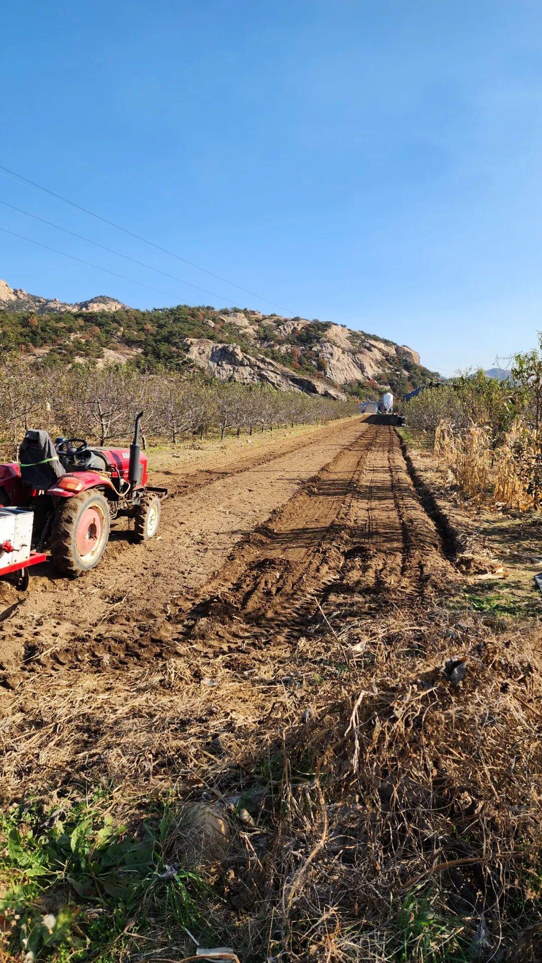 北山另外一侧的山坡上,是一层层梯田,种满了果树。此时的树上早已是果去枝空了:被幸福的果农们摘去享受丰收的喜悦了;远处的田野里,也收拾得空空荡荡的。地头边几株残存的玉米秸在风中无助地摇曳,显示着最后的倔强。而它们的脚下的土地上,村里农业队的机械正在播种着小麦,显示着生命的新陈代谢。东面的昆嵛湖在灿烂的阳光下,波光粼粼,荡漾在一片湖光山色里。更远处的昆嵛山迎来了一年里最好的季节:山岚叠翠、层林尽染。