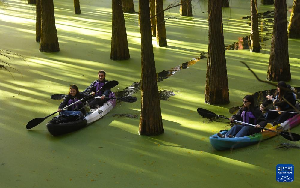 随着气温降低,浙江省杭州市青山湖的近百亩池杉、落羽杉披上色彩斑斓的“衣装”,和水面碧绿的浮萍相映成景。