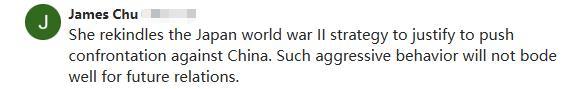 网友@James Chu表示:“(高市早苗)她重新煽动日本二战时期的战略,以此为理由推动对抗中国。这种咄咄逼人的行为对未来的中日关系发展绝无好处。”