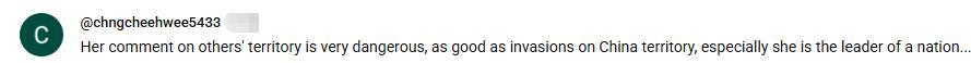网友@chngcheehwee5433认为:“她(高市早苗)对其他国家领土的评论非常危险,无异于入侵中国领土,尤其她还是一个国家的领导人。”
