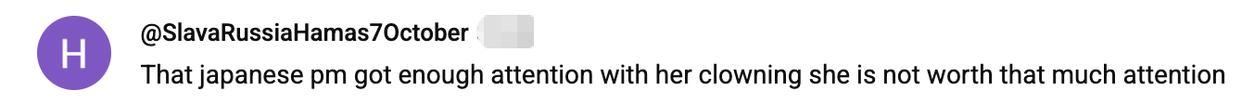 网友@SlavaRussiaHamas7October说:“那位日本首相靠着她的滑稽表演已经够引人注目了,她不值得再获得这么多关注。”