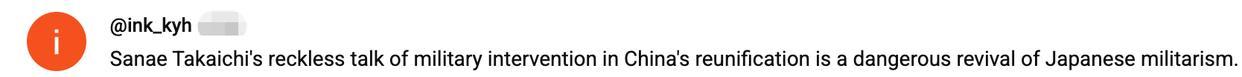 网友@ink_kyh认为:“高市早苗鲁莽地谈论军事干预中国统一,这是日本军国主义的危险复活。”
