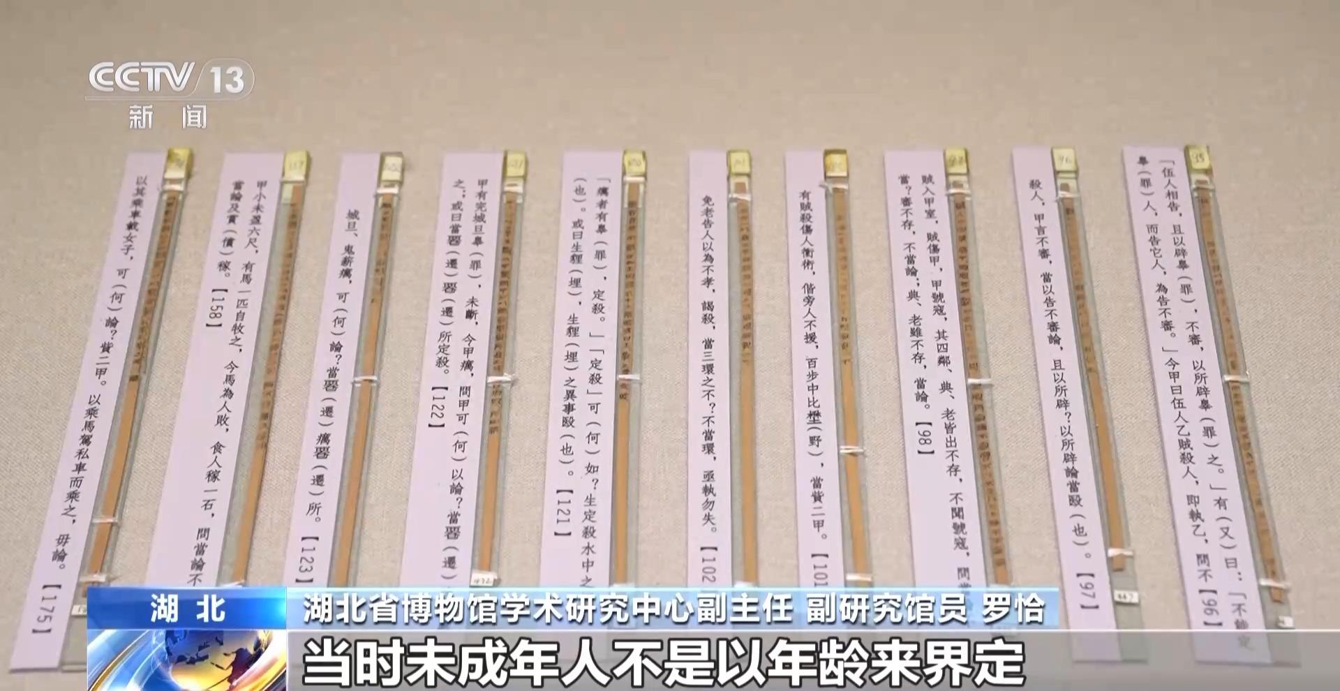 湖北省博物馆学术研究中心副主任 副研究馆员 罗恰:这一组就是睡虎地秦简里面的《法律答问》,这里面就有目前我们发现的最早的“未成年人保护法”。当时未成年人不是以年龄来界定,他是以身高6尺(来界定),大概相当于现在不到1米39的样子,6尺以下是未成年人。这里面讲不到6尺的一个小孩去放马,马受到了惊扰,就吃掉了人家一石的庄稼。那么现在就问——这个小孩该不该受到惩处,回答是不该受到惩处,而且也不用去赔偿庄稼,这也是当时对未成年人进行一个特殊照顾(的体现)。