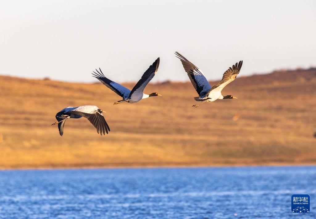 11月29日,黑颈鹤在大山包黑颈鹤国家级自然保护区内的大海子湿地飞舞。