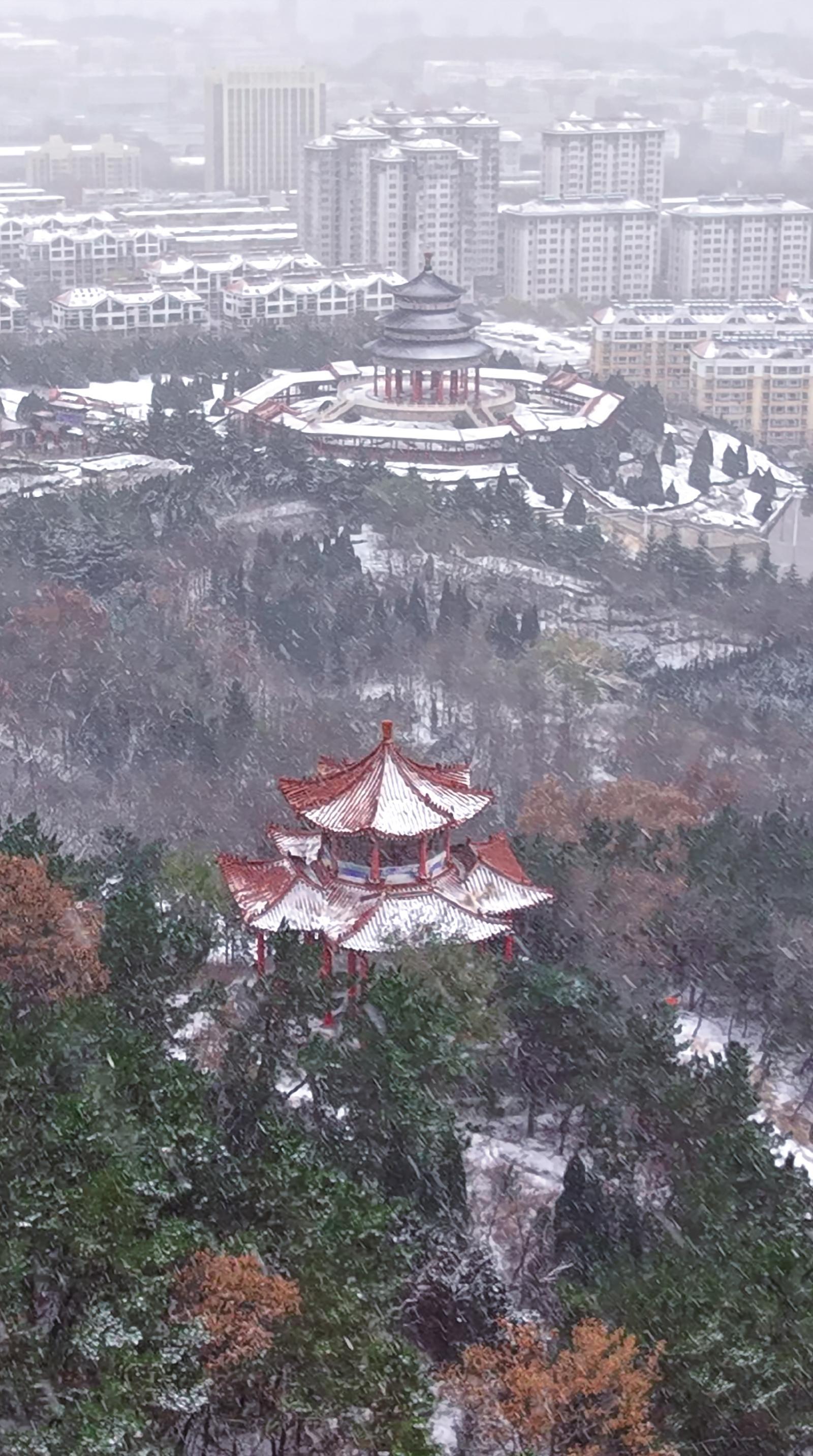 昨天,烟台迎来入冬后的首场降雪。风雪中的山林与山脚下的亭阁、居民楼相映成趣,构成一幅美丽画卷。 张建 摄