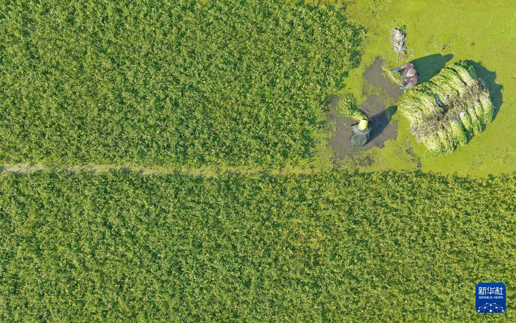 12月7日,江苏省海安市墩头镇长垎村水芹菜种植基地,菜农在水田里采收水芹菜(无人机照片)。
