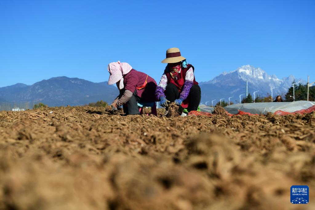 12月7日,农民在云南省丽江市玉龙县黄山街道的一处空地分拣、晾晒中药材当归。