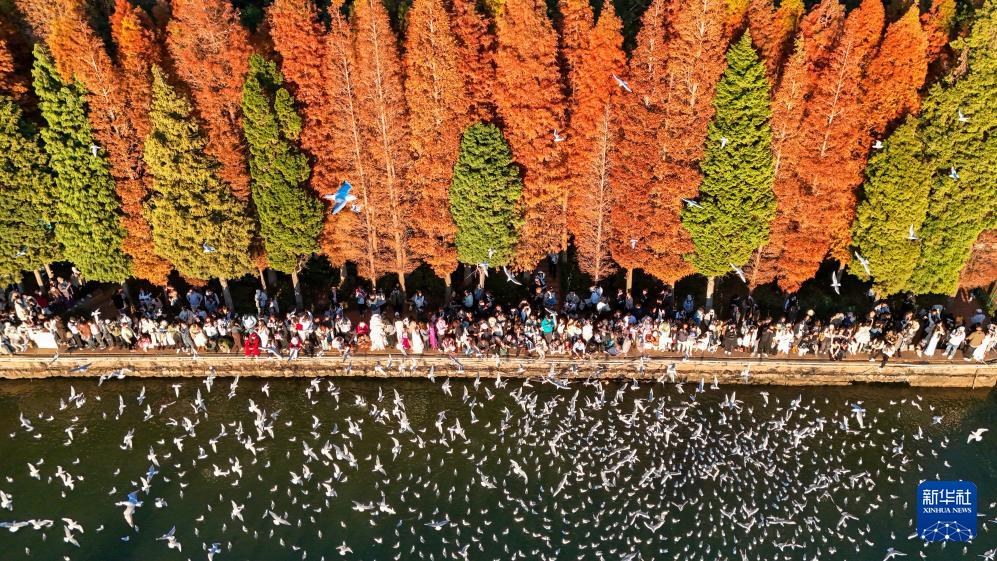12月10日,游客在滇池畔的海洪湿地公园喂红嘴鸥(无人机照片)。