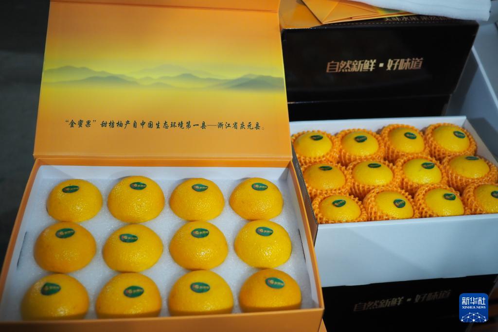 这是12月11日在浙江省庆元县竹口镇黄坛水干果园区内拍摄的分装好的甜桔柚礼盒。