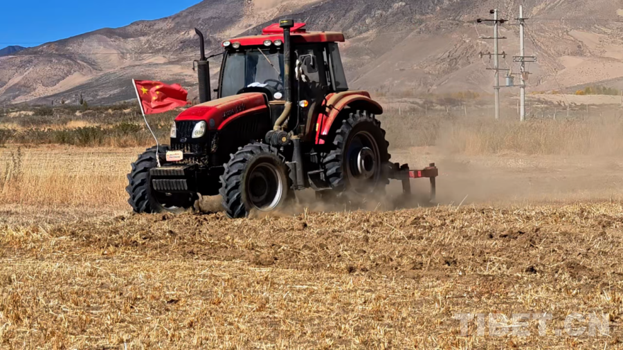 图为江玛坚村综合加工农民专业合作社的农机正在田地间工作