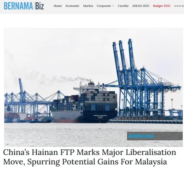 马来西亚国家新闻社近日刊文称,海南自由贸易港将于12月18日正式启动全岛封关,马来西亚有望从中获益。文章称,中国此举再次印证中国在经济领域的持续开放姿态,并显著提升中国在全球贸易体系中的地位。