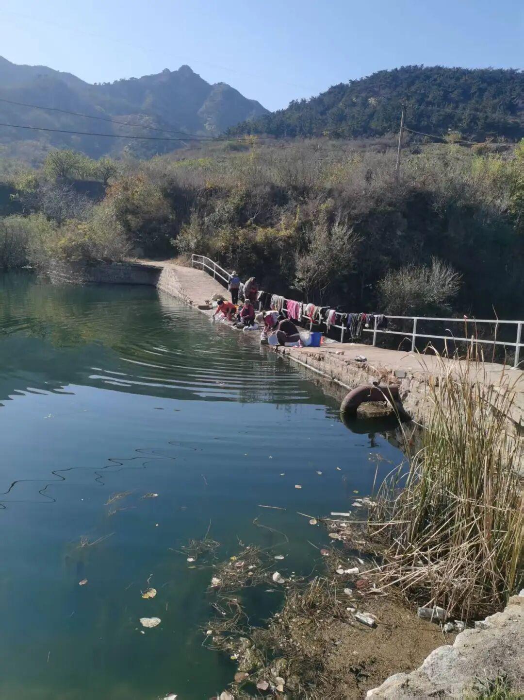 山沟有一处拦水小坝,将山泉水雨水截留在这,形成一座小池塘,山坡的树影倒映在池塘里,犹如一幅国画中的山水画,很是美。水的洁净让山下村妇骑着电动车到这洗衣服,三五个人结伴而来,不一会七八个人来了,说是来洗衣服,不如说是开欢乐颂的,那洗衣服的木槌击打声、叽叽喳喳的欢乐声,把山沟里的小鸟都吓跑了,池塘的鱼也惊吓的躲在深处偷偷观察。池塘边上茂盛的树枝,成为天然的晾衣架,小到袜子大到床单,把能晒的都晒在这天然的晒衣场。看到这情景,我敢说,如果是夏天,傍黑天这绝对是上好的天然浴池。