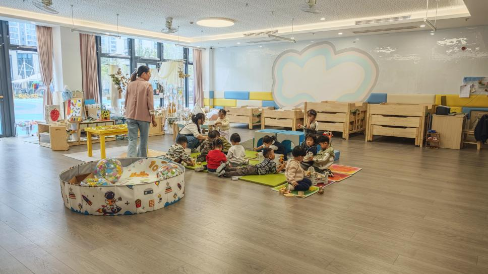 “很多二胎家庭的孩子,老大在我们隔壁的小学读书,老二就在我们这里上托班。”朱臣介绍,上虞以公办幼儿园为主导推行“托育教育一体化”模式,突出普惠性与惠民性,降低家庭育儿成本,并基于2岁至3岁婴幼儿身心发展特点设计服务内容,实现照护与教育的有机统一。