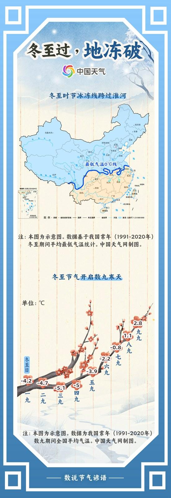 “冬至过,地冻破”,这一谚语就描绘了冬至过后严寒来临、大地冰封的寒冷景象。中国天气网通过盘点1991年至2020年气象大数据发现,常年冬至期间,最低气温0℃线已跨过淮河,抵达苏皖中部、湖北北部、陕西南部至云南西北部一线。此时北方大部寒风刺骨,天寒地冻;南方多地可能出现降雪或冻雨,湿冷难耐。