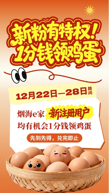发福蛋了!烟海e家客户端“新粉有特权,1分钱领鸡蛋”活动今日正式启动!即日起至28日24时,烟海e家新注册用户“1分钱+100积分”,即可领到一盒(10枚)新鲜鸡蛋。总量700盒,先到先得,兑完即止!