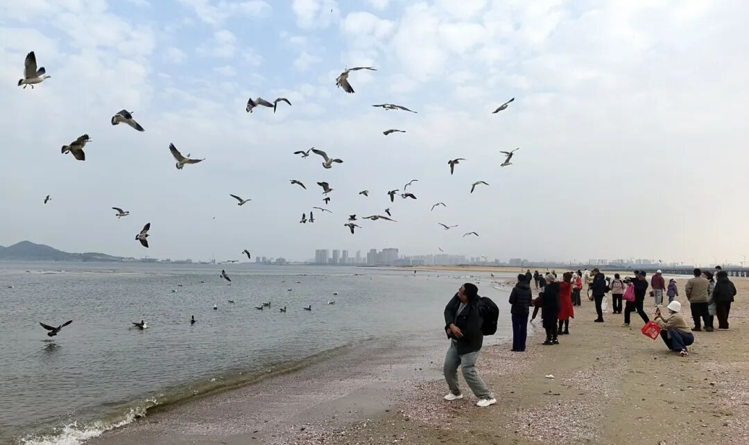 沙滩上,不少市民游客向海鸥投喂面包、火腿肠等食物,成群海鸥应声而来,在空中盘旋抢食,场面蔚为壮观。“近年来,市民生态保护意识显著提升,市民对鸟类愈发友好,不驱赶、不惊吓的行为,也让海鸥逐渐放下戒备,与人类近距离相处。”专家说,大家与鸟亲近的热情,也从侧面反映出全社会鸟类保护意识的提升。