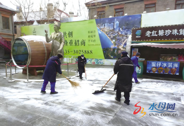 24日夜间到25日中午,烟台迎来降雪天气。烟台蓝天智慧物业、城管队员迅速行动,清雪防滑保畅通。YMG全媒体记者 杨春娜 通讯员 袁磊 焦斐然 摄