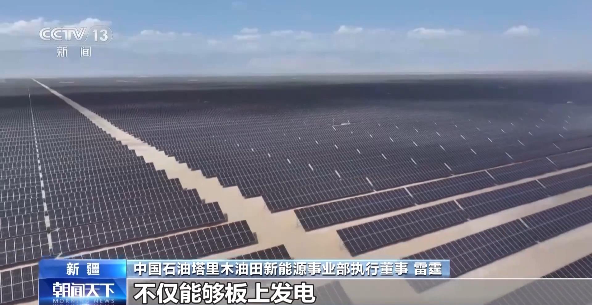 中国石油塔里木油田新能源事业部执行董事 雷霆:我们通过在流沙上建设光伏板,不仅能在板上发电,还降低了风速,营造了阴凉,在板下铺设滴灌带进行生物治沙,一举多赢。预计到明年,我们的装机将超过400万千瓦。