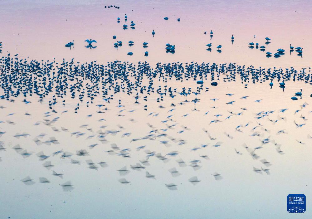 近日,大批候鸟飞抵江苏省兴化市里下河国家湿地公园,成群结队在浅滩觅食、休憩。近年来,当地生态环境持续改善,越冬候鸟数量逐年增多。