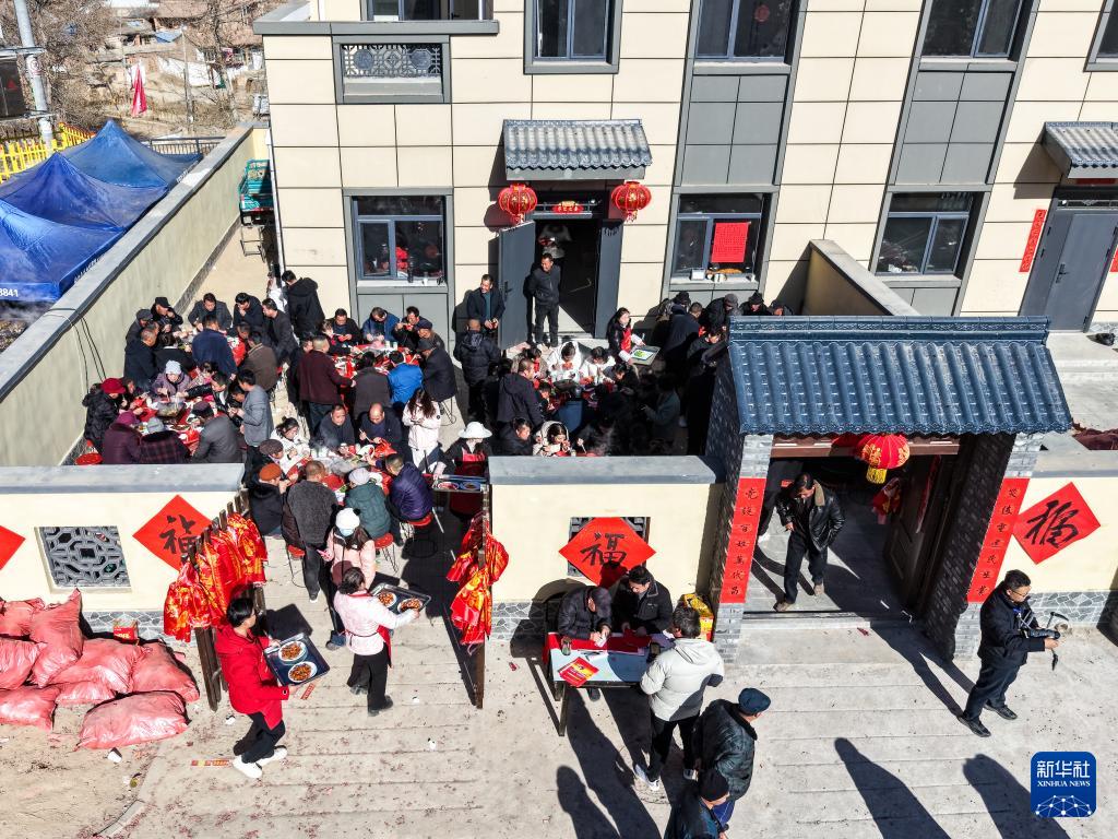 12月29日,村民在榆中县马坡乡马莲滩村集中安置点的新家里举办乔迁宴(无人机照片)。