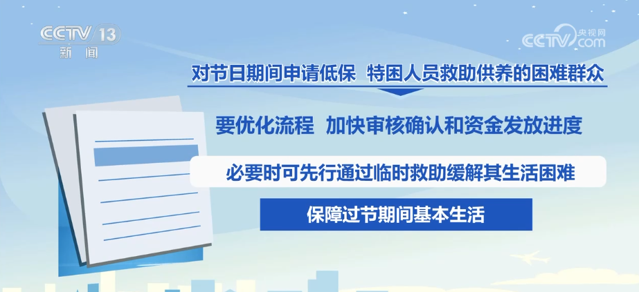 《通知》要求,元旦、春节期间,各地要对辖区内低保对象、特困人员、等各类困难群众进行走访探视,深入了解困难群众实际生活状况,帮助他们渡过生活难关。