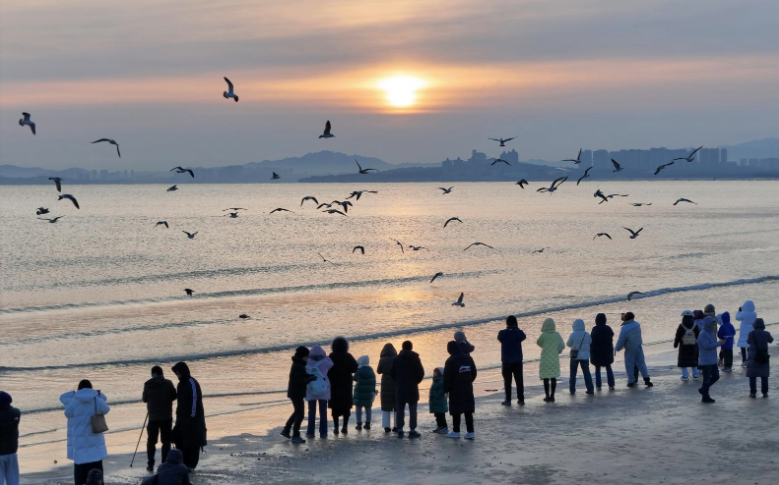 2026年第一天,在莱山区海滨,市民和游客们迎接新年第一轮朝阳。YMG全媒体记者 唐克 摄