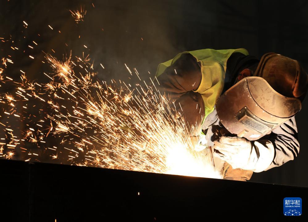 1月5日,在中铁科工集团武汉江夏制造基地,技术工人对门吊配件进行焊接作业。