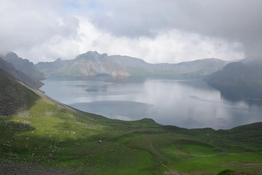 天池边依旧游客如织,不同的是,之前的麻绳拦挡换成的结实又漂亮的不锈钢栏杆。刚下车时,阴晴不定的天空飘起雨丝。等我们挤到天池边上,雨神把雨水收走了,阳光怯怯地从灰蓝的云彩之间露出头来。刚刚浮起的水雾在慢慢散去,魂牵梦萦的天池,如同一位害羞的仙女轻轻撩起了面纱。虽然没有八年前的碧水蓝天那么令人惊艳,但介于藏青与瓦灰之间的池水与山峰,别有一番冷艳的气质。