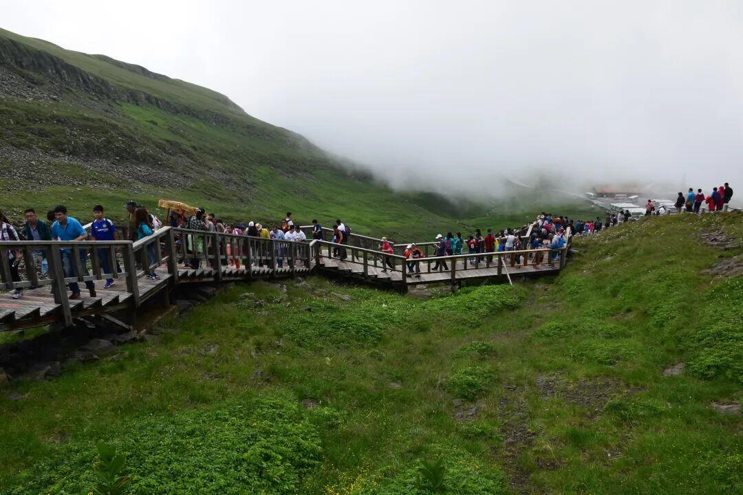 在山脚下,踩着黑褐色的火山碎石,我们在长白瀑布的前方合影留念,先乘景区环保车到主峰换越野车,车行驶在之字形的盘山公路上,全程72道弯,每到转弯处,大家都倒向外侧,在耳边的惊呼中感受卡丁车般的惊险刺激。路边的植被随时随刻地变化着,一开始能看到亮眼的长白杜鹃与婀娜多姿的高山罂粟,渐渐地只留下倒根草和遍布满山的高山桧,到最后只剩下苔藓与广阔的群山,雄浑而博大,山渐渐变低矮,最后全部被丢到脚下。艺高胆大的司机仗着在这条道上长年累月的行驶经验,如同参加拉力锦标赛一样,把游客送到长白山最高峰“天文峰”,再沿着木阶梯向上攀爬。我边爬边暗暗祈祷能顺利看到天池的真面目。