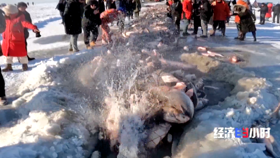 为了吸引游客,查干湖还推出私人订制捕鱼、冰下盲盒等新项目。100米长的挂网,游客组队拉拽,亲手捕鱼后,可以直接送进后厨做成铁锅炖。