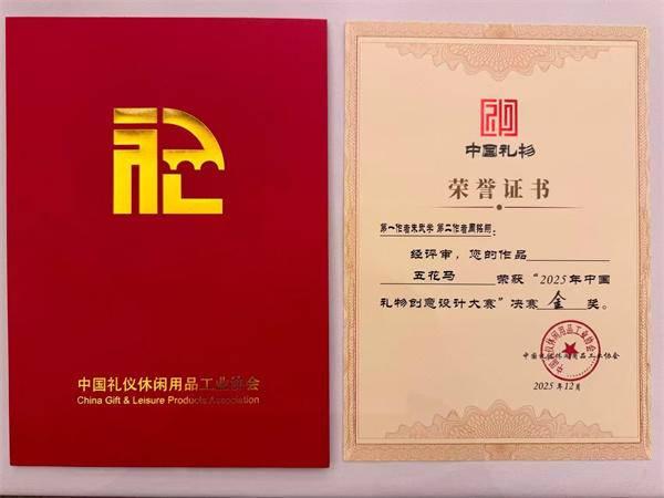 水母网讯 近日,由中国礼仪休闲用品工业协会举办的2025年“中国礼物”创意设计大赛决赛评审结果揭晓,烟台高新区企业烟台民生印花艺品有限公司选送的“五花马”生肖布艺产品,凭借深厚的文化底蕴、精湛的非遗工艺与创新的设计理念,在全国数千件参赛作品中脱颖而出,成功斩获金奖并入选“中国礼物”推荐名录,成为兼具非遗传承与国潮品牌的文创精品。