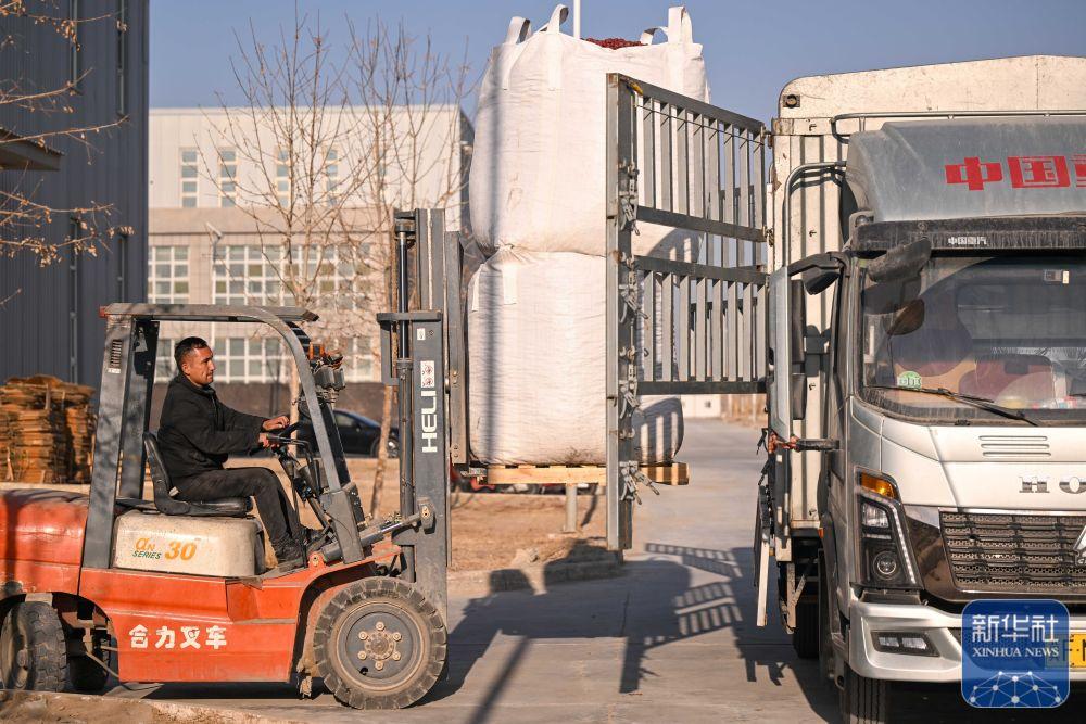 ↑ 在新疆和田地区墨玉县,和田源疆食品有限公司的工作人员将红枣装车准备运往河北(1月9日摄)。