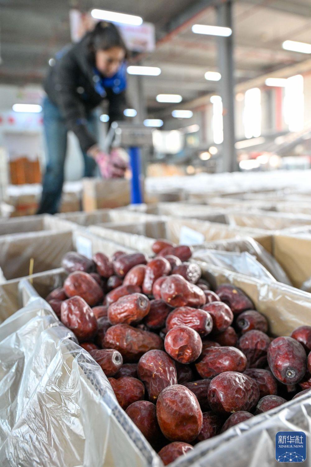 ↑ 在新疆和田地区墨玉县,新疆自由落体网络科技有限公司的工作人员将红枣装箱(1月9日摄)。