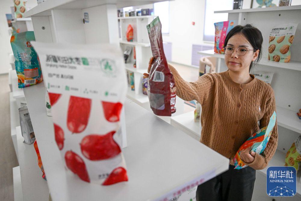 ↑ 在新疆和田地区墨玉县,新疆自由落体网络科技有限公司的工作人员在整理展示商品(1月9日摄)。