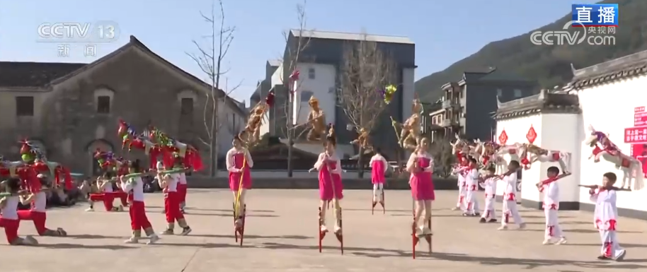 旁边进行的是踩高跷表演,和北方高跷相比,河上镇高跷的高度并不算高,但却格外讲究“鲜”跟“活”。小朋友们踩着高跷,时而转身,时而跳跃,动作灵动又惊险,这正是传统文化传承中最动人的模样。