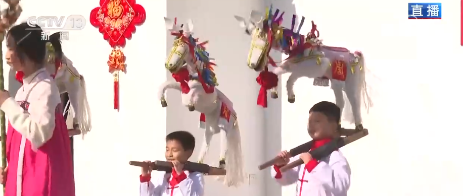 逛得尽兴,更有好戏看!市集舞台区的非遗民俗表演,表演者都是小朋友。首先登场的是背马表演,它是国家级非遗“河上龙灯胜会”的重要组成部分。孩子们身上背着装饰精美的“竹马”,踏着鼓点昂首前行,它们也是龙灯队伍的“开路先锋”,瞬间把热闹氛围给拉满。
