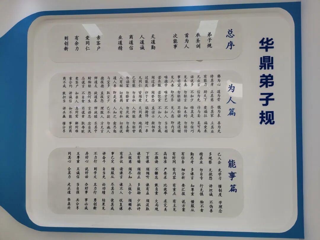我们边走边看,在企业展览室里,我看到他创作的《弟子规》,弟子规,承圣训,首为人,次能事,天道勤,人道诚,商道信,业道精,亲客户,爱同仁,有余力,则创新……还看到了他作词的气势雄浑的《华鼎之歌》:昆嵛巍巍,黄渤泱泱,华鼎伊始,其道大光,学科技以创新,承文化得绵长,光与火兮并茂,智与慧兮齐放……在职工食堂里我还看到他写的《劝俭词》:计功多少,量彼来处,付已德行,全缺应供……