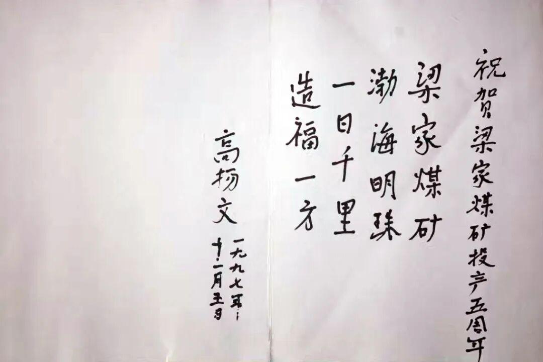 1992年8月,原国家煤炭工业部部长高扬文在梁家煤矿视察时题词。(于泉城 摄影)