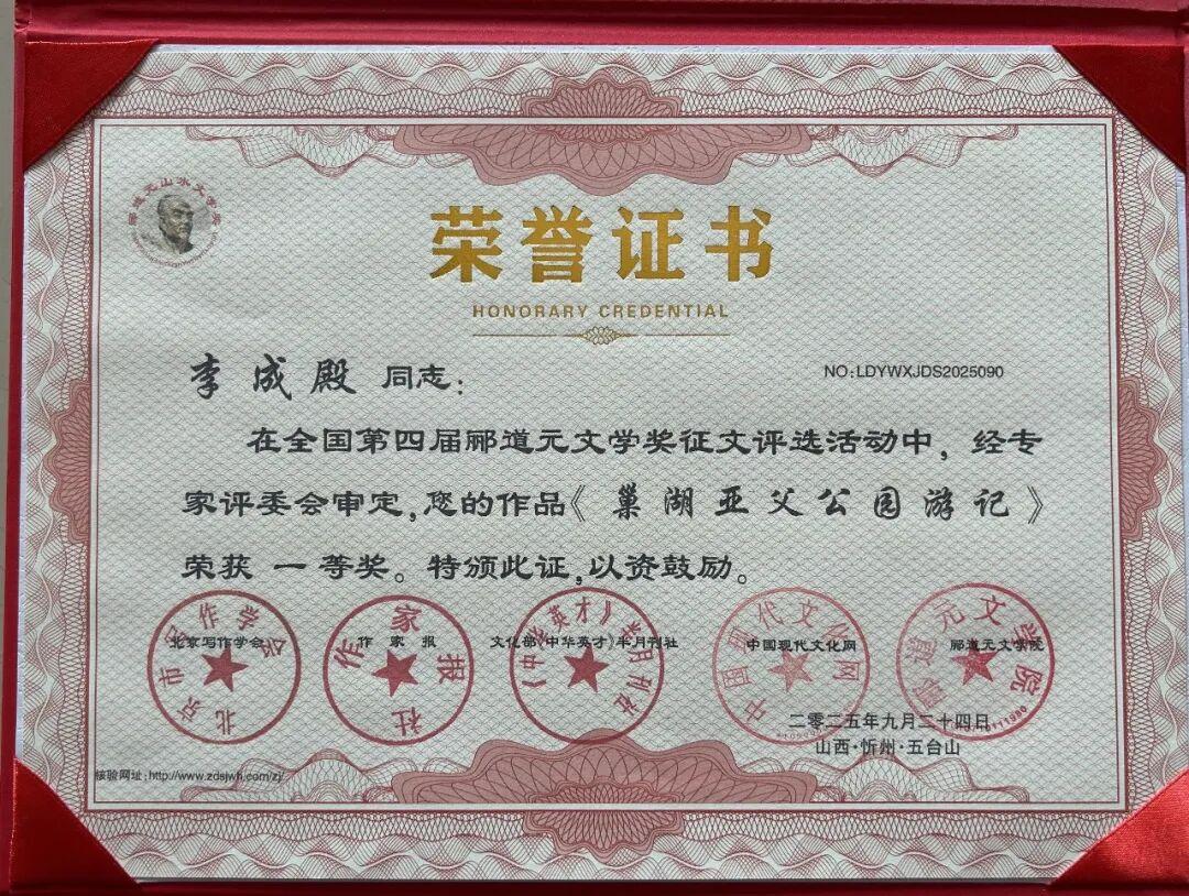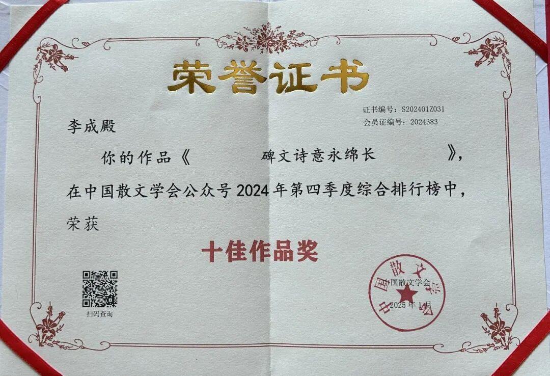2025年的钟声还在耳畔萦绕,中国散文学会寄来的“十佳作品”荣誉证书和500元奖金便翩然而至,仿佛为新年的乐章添上了第一个悦耳的音符。这份惊喜来得如此突然,又如此珍贵,让我这个退休多年的新闻工作者,在文学创作的道路上,真切感受到了“锲而不舍,金石可镂”的深刻内涵。
